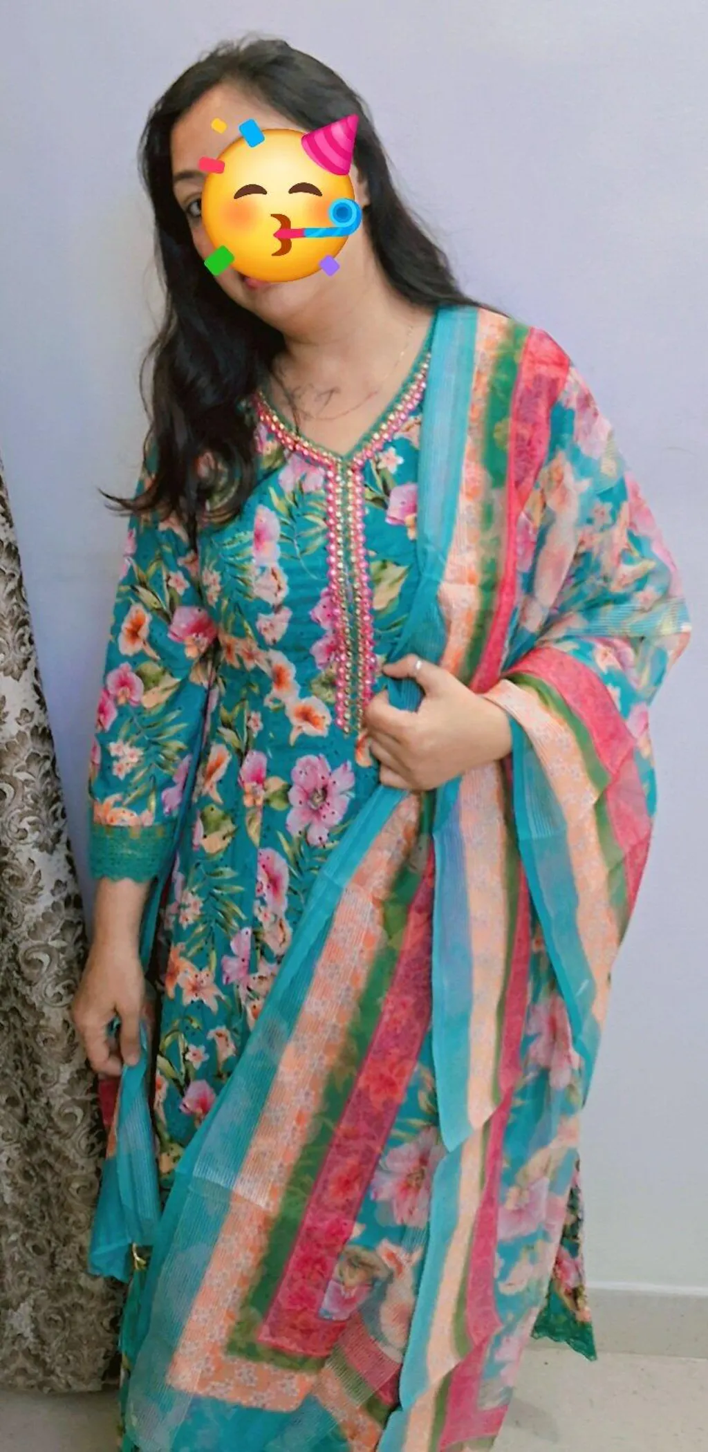 This outfit is a 3-piece Anarkali suit set with a kurta, bottom, and dupatta. It is simple to wear and gives you a stylish look. Perfect for festivals, parties, or daily wear, this suit brings together comfort, beauty, and tradition in one outfit.