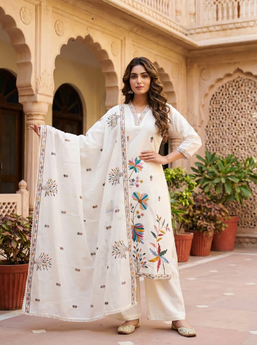 Elegant Ivory Floral Embroidered Kurta Set with Dupatta