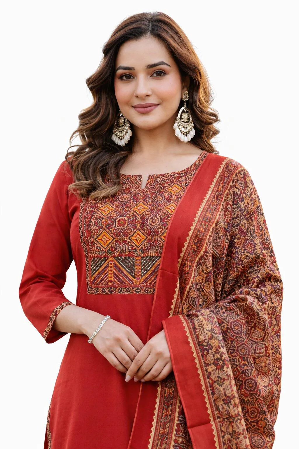 Add a bold touch of tradition to your wardrobe with the Ruaati Women Red Embroidered Straight Kurta with Ethnic Yoke Design. Crafted in a rich red hue, this kurta beautifully showcases intricate ethnic artistry through its detailed embroidered yoke.